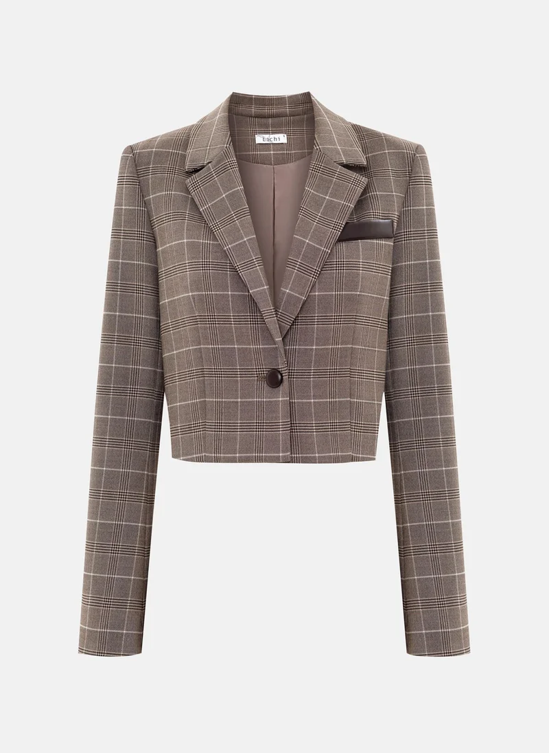Shortened single-breasted jacket with V-neckline, long sleeves and large button fastening, made from dense checked fabric to form a set with the matching mini skirt.- cropped model- straight single-breasted cut- V- neckline- long sleeves- button fastening