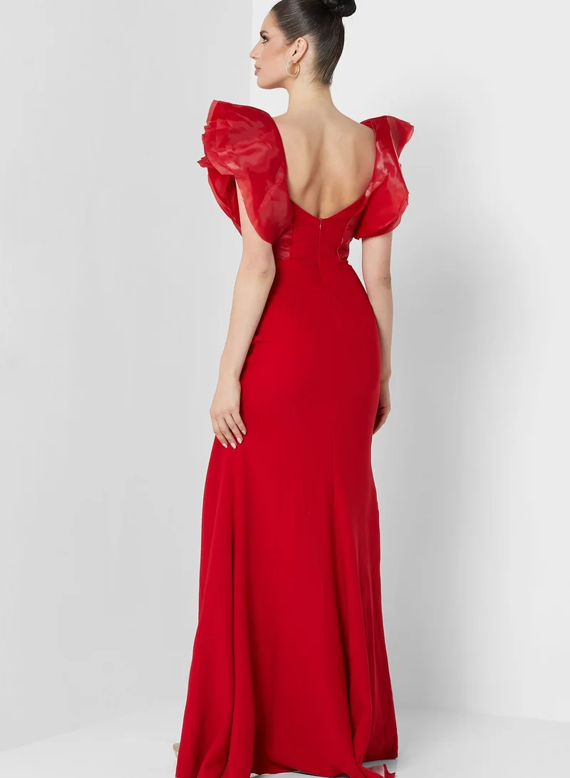 List Ruffle Sleeve Plunge Neck Front Slit Dress