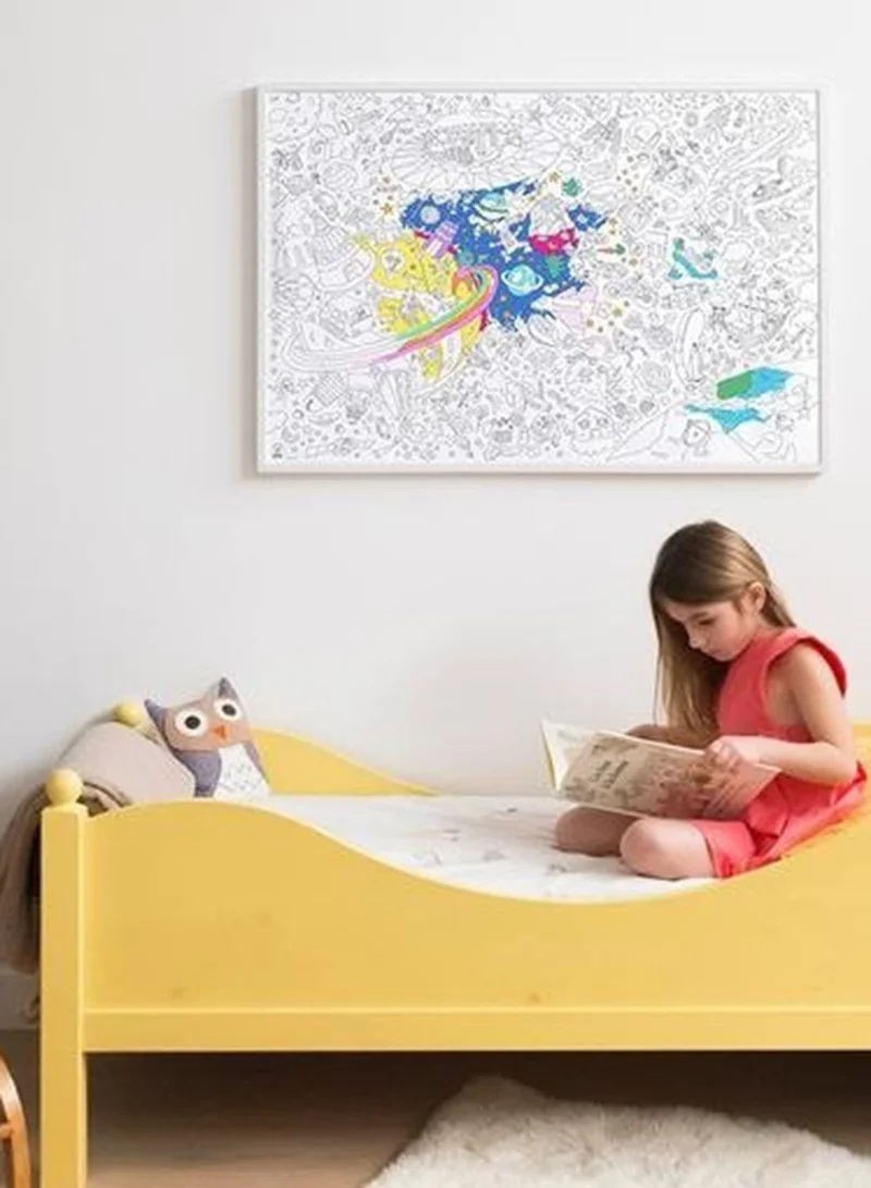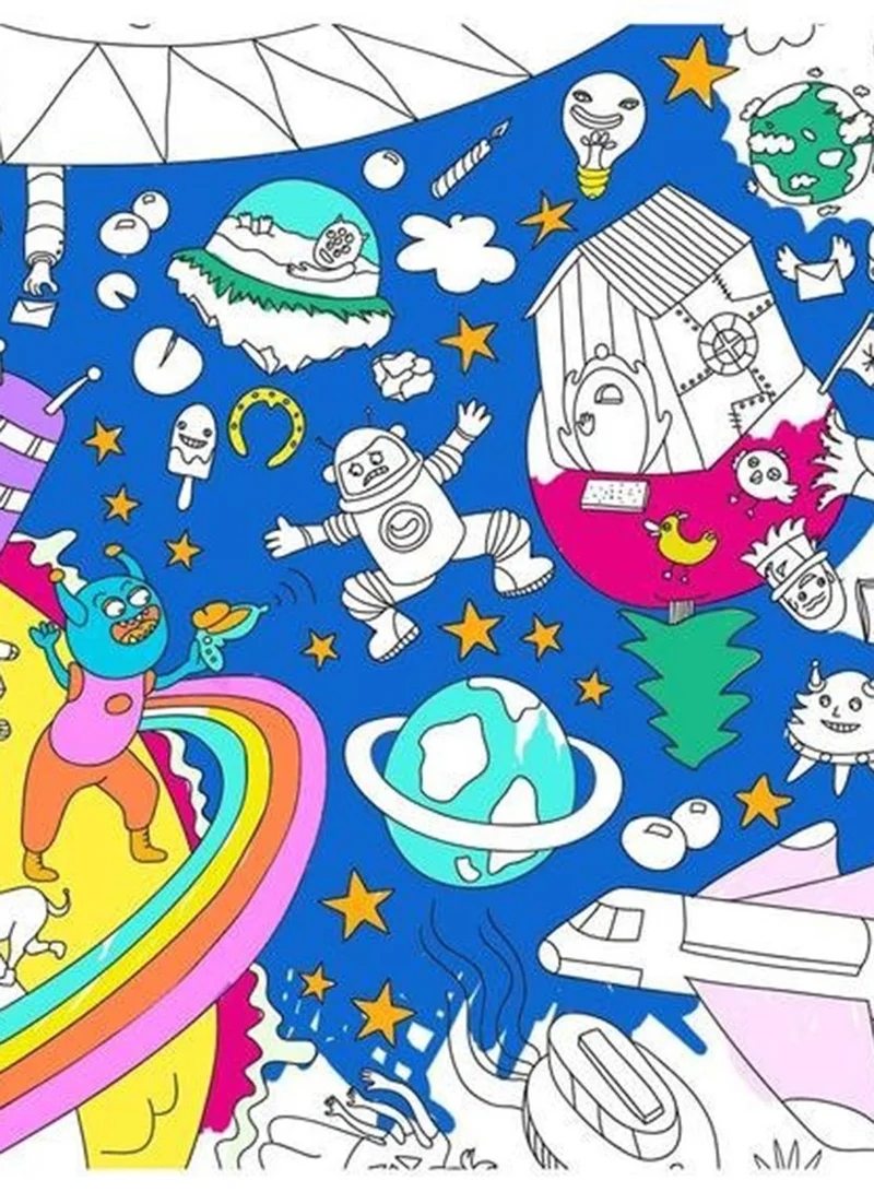 Travel to the moon and back with this funny poster packed full of stars and aliens. Hundreds of tiny details, and a huge sense of humor the whole family will enjoy! Hours of coloring fun alone or with friends, use the poster as a tablecloth, wallpaper... The possibilities are endless!
