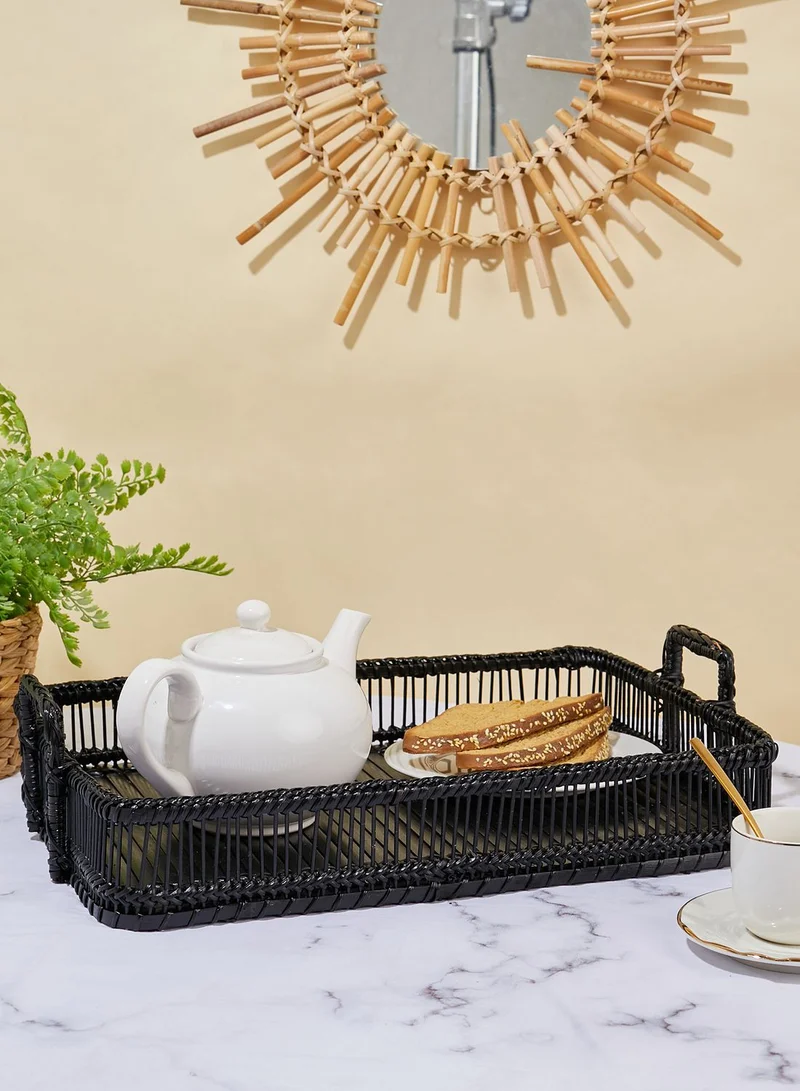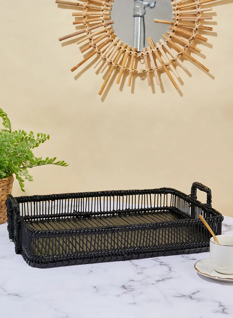 Hand-woven from eco-friendly black rattan and bamboo, this tray will bring natural warmth and character to a range of decors. This versatile tray in rustic texture is complete with easy to hold side handles providing a smooth hold and transportation.