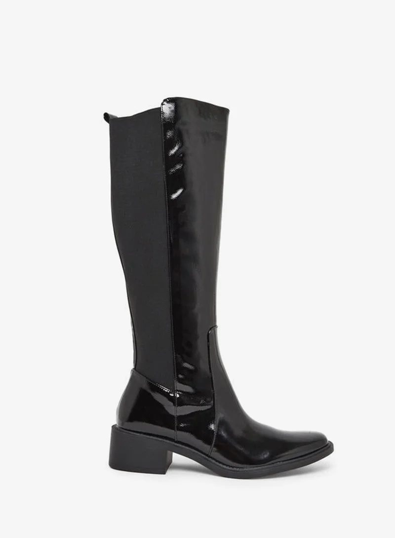 Step out in style with these Black Patent Knee-High Boots. Featuring a mid-heel, almond toe, and full zip closure.