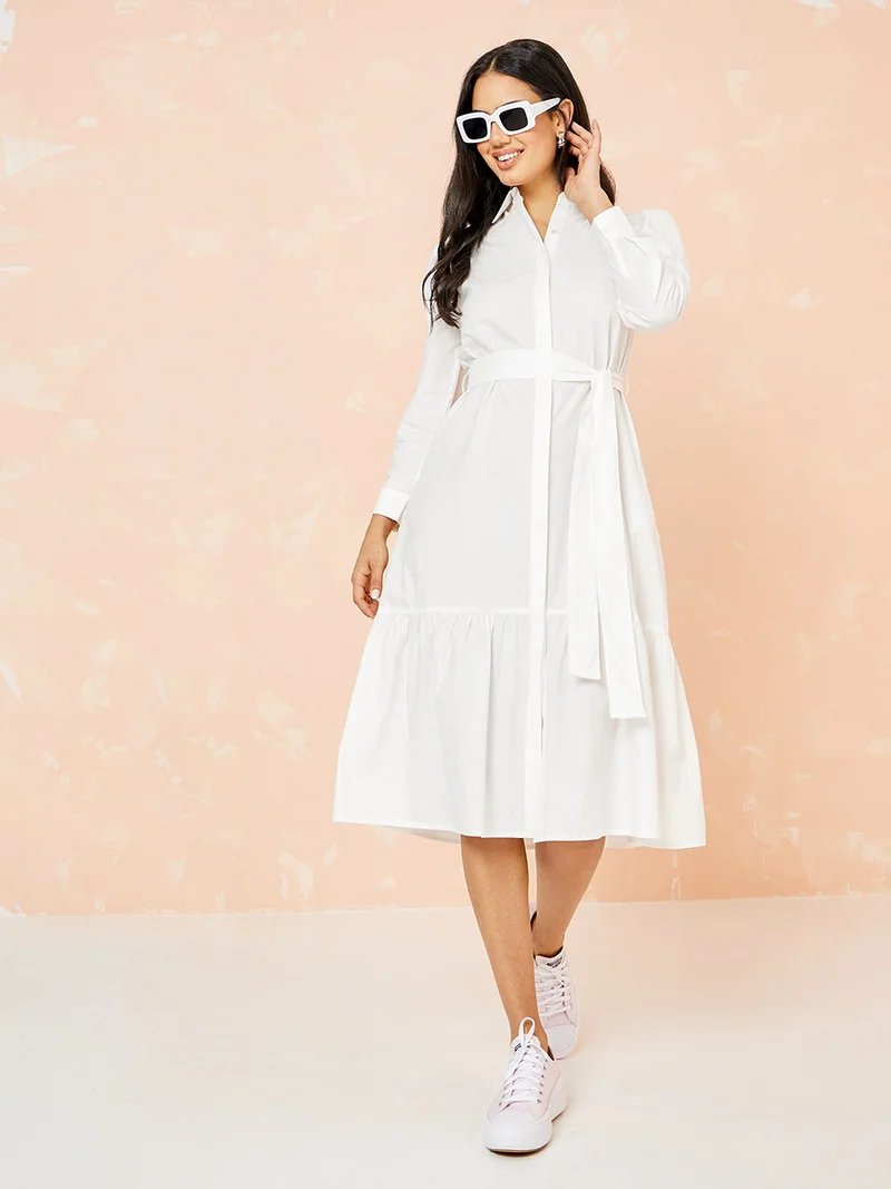 Styli Long Sleeves Concealed Placket Shirt Midi Dress with Tie Belt