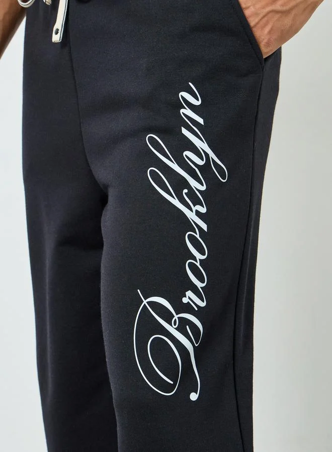 Black oversized joggers crafted from a comfortable poly-blend knit. Featuring a bold "Brooklyn" slogan graphic on the thigh and a drawstring elastic waistband for a custom fit. Finished with unique zippered ankle cuffs revealing contrast grey gussets, these pants are essential for effortless streetwear styling.