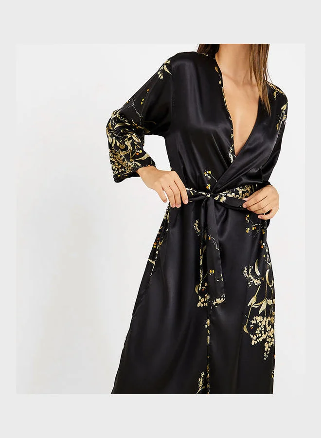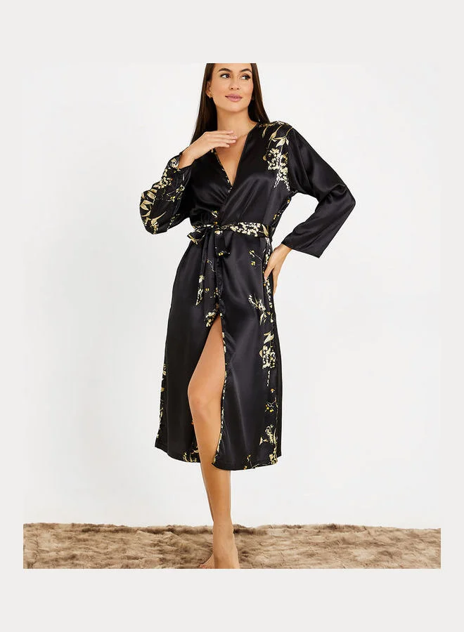 Styli Satin Leafy Stem Print Belted Midi Robe