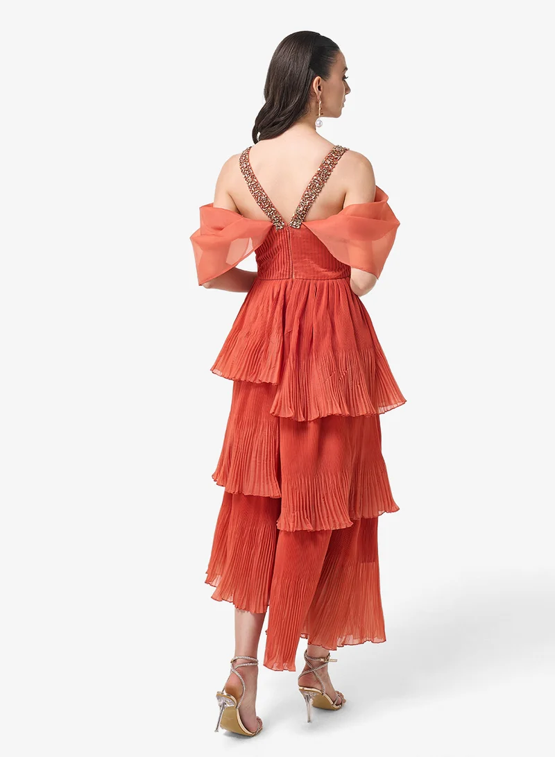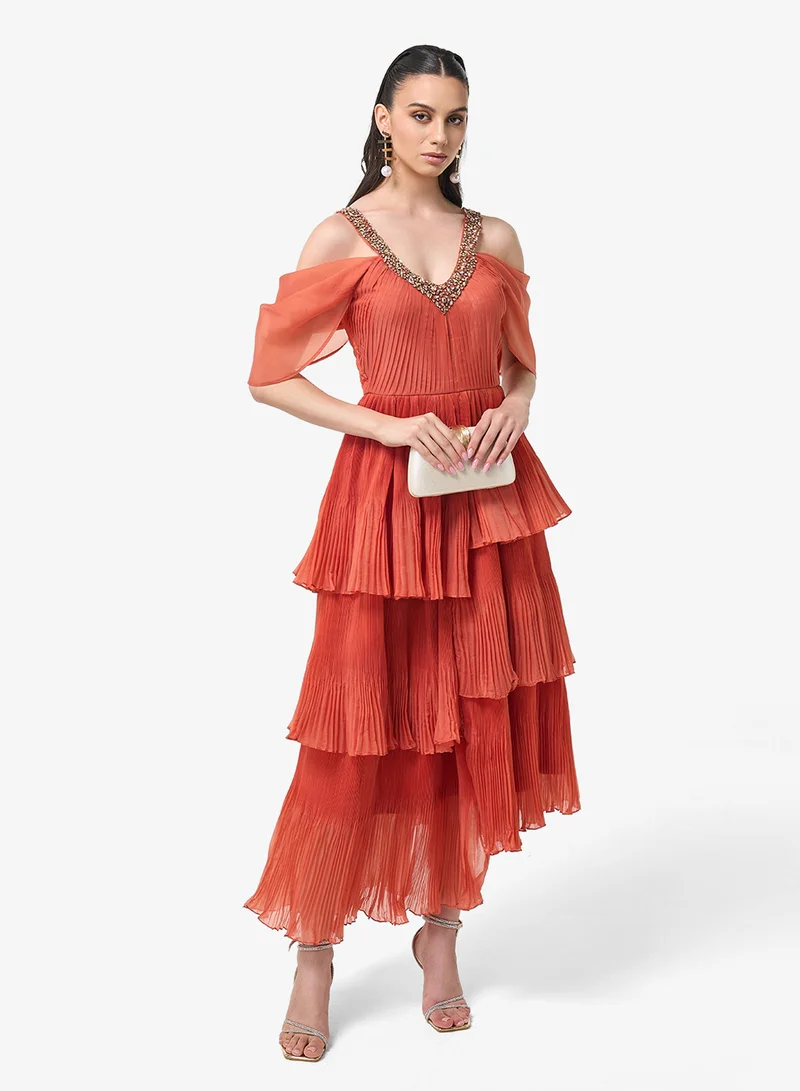 Threadz by Ajooni V-Neck Ruffle Cold Shoulder Maxi Dress