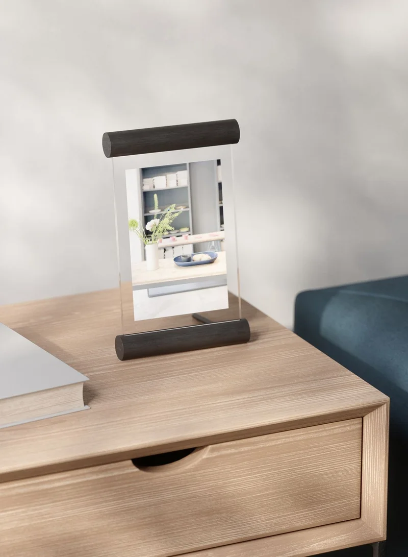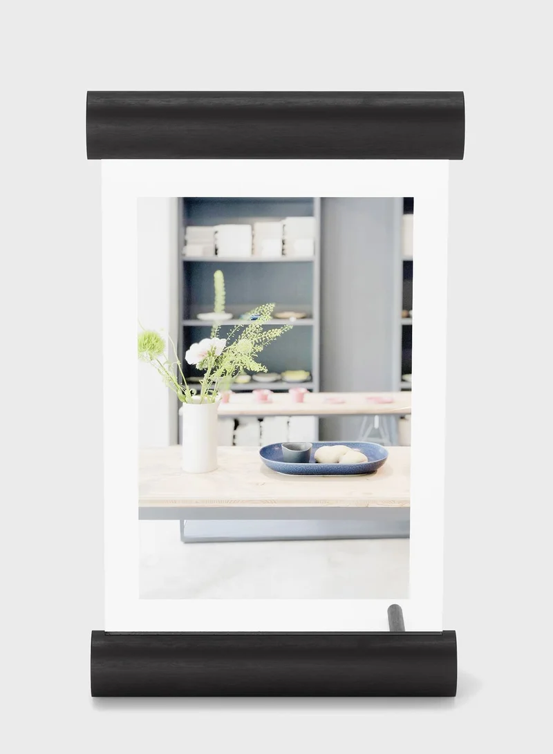 Scroll is a modern floating picture frame with wooden dowels and exposed tempered glass. Whether displayed vertically or horizontally on your tabletop, Scroll can be used for both portrait and landscape photos.