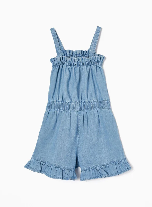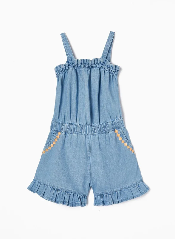 Cotton denim short jumpsuit for girls. Adjustable straps. Elasticated waist and chest for a perfect fit. Pockets with contrasting orange embroidery. Hems with ruffles. A light and comfortable piece for casual and stylish summer looks.