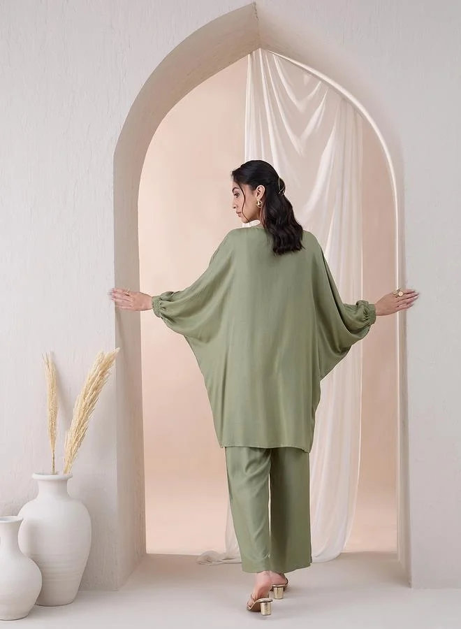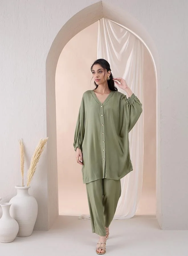 طقم تونيك سادة بأزرار وبنطلون مستقيم من فيميلا