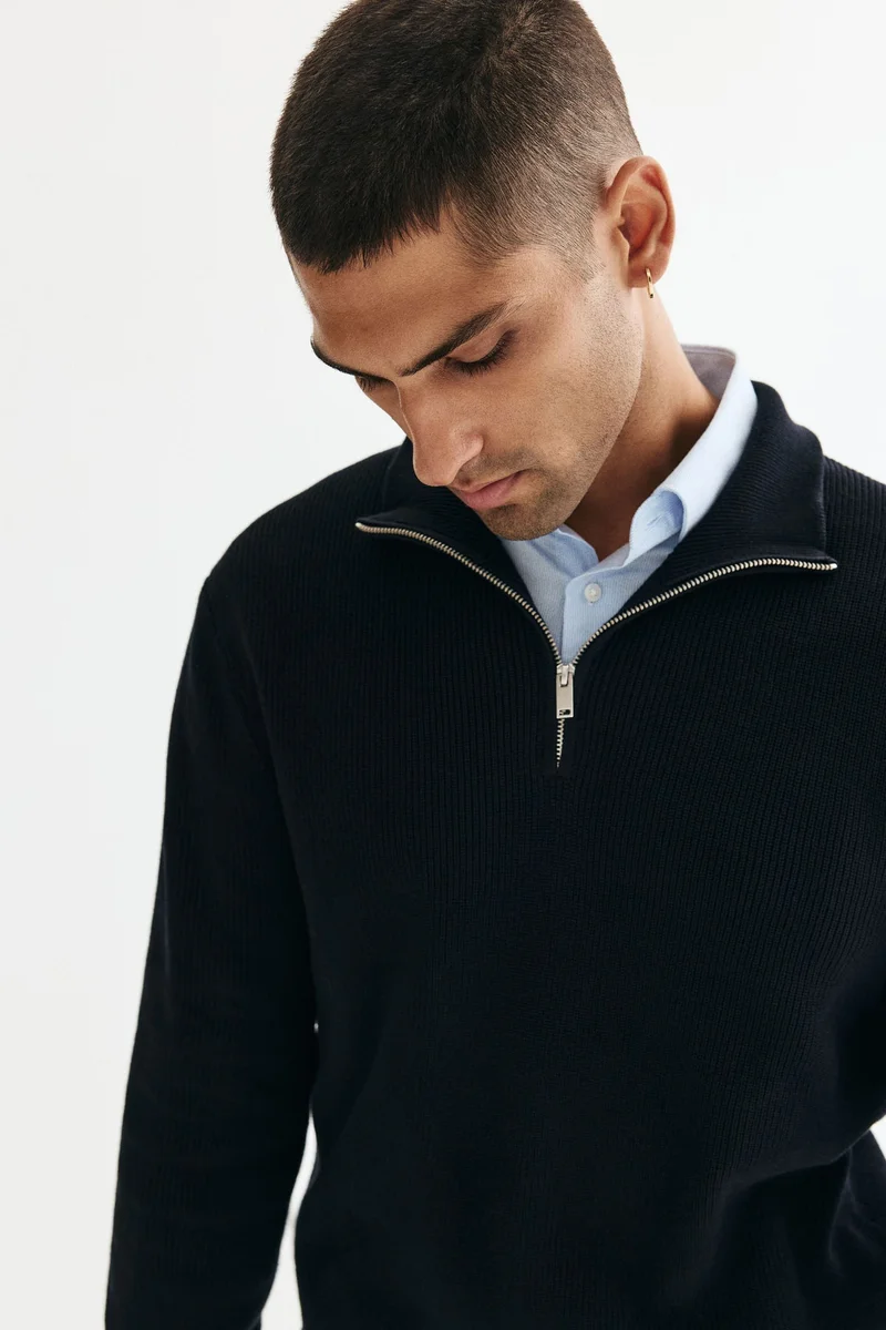 كنزة بتصميم من حياكة قطنية ناعمة. تتميز بياقة قائمة وسحاب علوي، مع أكمام طويلة، بالإضافة إلى حافة سفلية مستقيمة. تأتي بقصّة عادية لارتداء مريح ومظهر كلاسيكي.