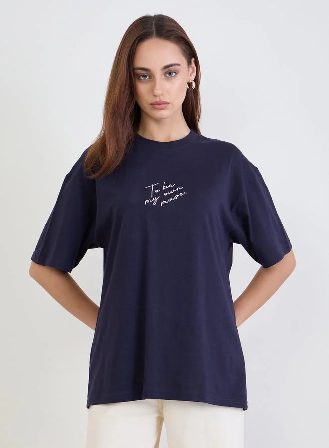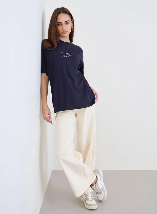ستايلي تيشيرت واسع مُطرّز بكتابة مع أكمام قصيرة