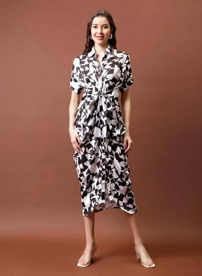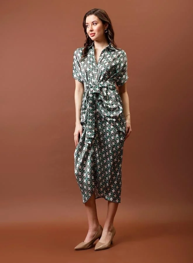 Printed Satin Shirt Midi Dress with Pleated Detail