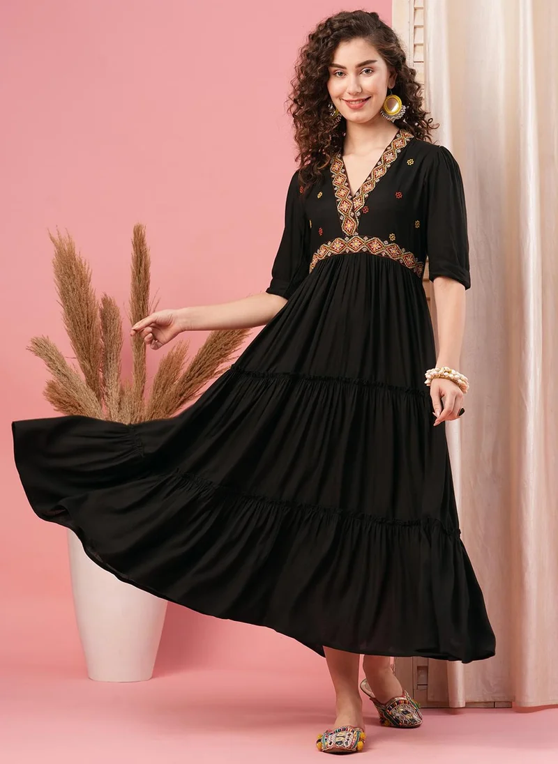 Globus Women Embroidered V-Neck Puff Sleeves Gathered & Tiered A-Line Midi Festive Dress