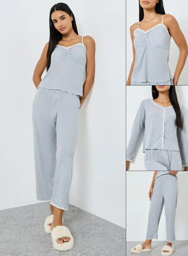 Tie Front Lace Detail Trim Long Sleeve Top and Pyjama Set