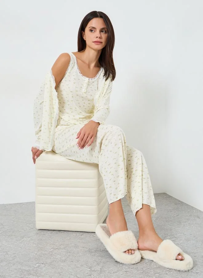 Broderie Lace Trim Detail Ruffle Neck Slip Dress & Robe Set