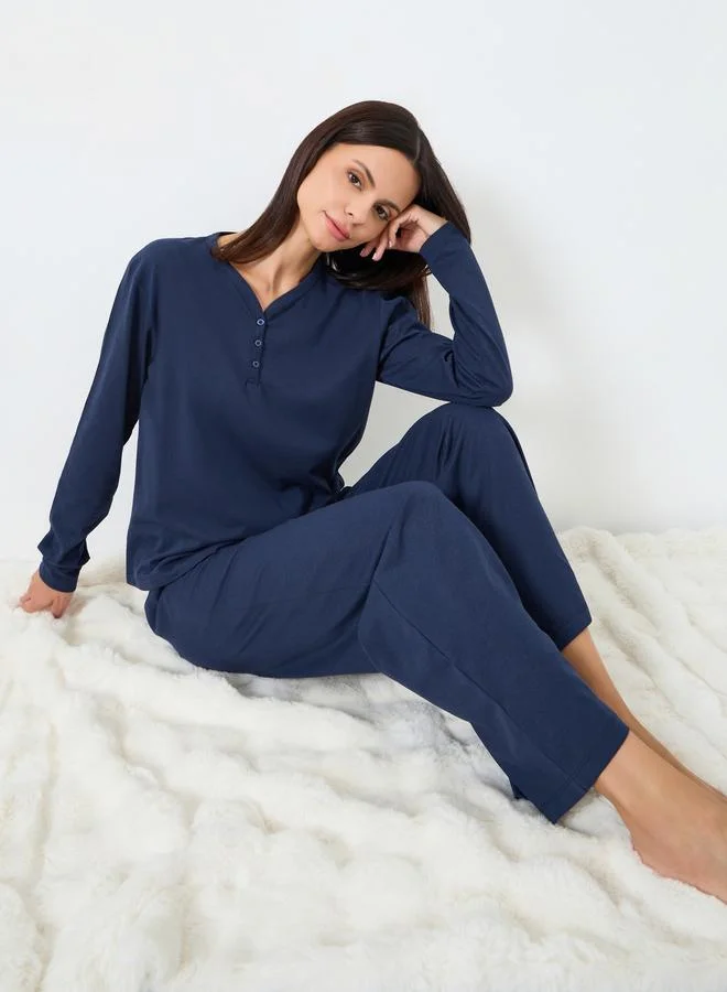 Styli Textured Striped Buttoned Shirt and Pyjama Set