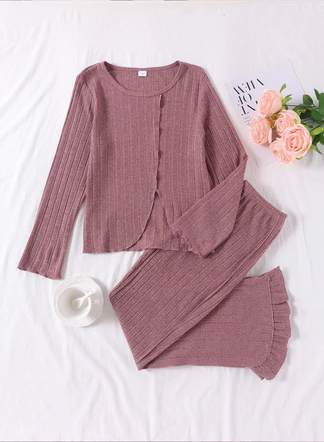 Textured Asymmetric Hem Top and Ruffle Hem Pyjama Set