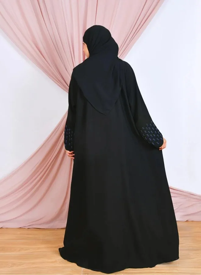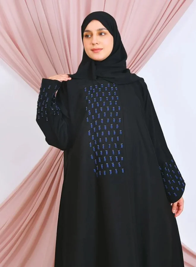 Black closed abaya with snap buttons, adorned with prominent navy blue embroidery
