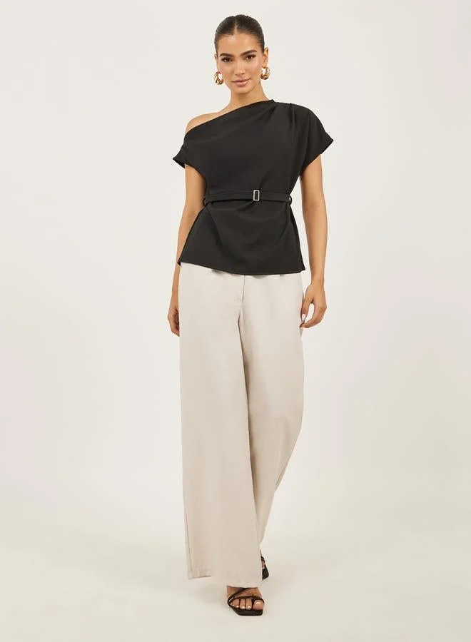 Styli Asymmetric Neck Short Sleeves Belted Top