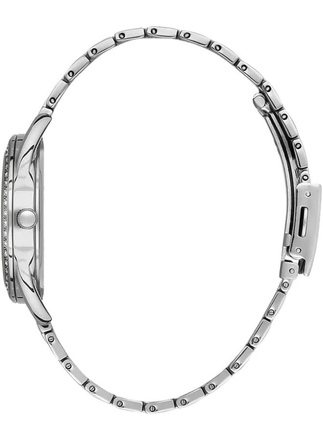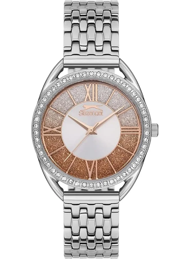 This elegant Slazenger women's watch features a round metal silver case with a stylish analog display. The watch has a 35mm case diameter and a silver dial that is beautifully complemented by a sparkling bezel adorned with crystals. The quartz movement ensures accurate timekeeping, while the silver metal bracelet with a push button clasp provides a secure and comfortable fit. With a water resistance of up to 30 meters, this watch is both fashionable and functional, making it a perfect accessory for any occasion.