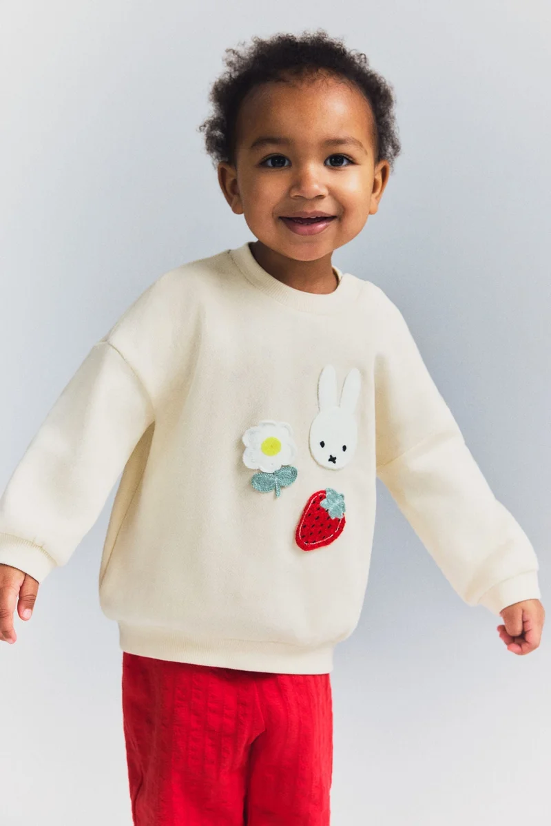 Top in soft, lightweight sweatshirt fabric with appliqué patches on the front. Round, rib-trimmed neckline with press-studs on one side (except in sizes 2–4Y), low dropped shoulders and ribbing at the cuffs and hem.