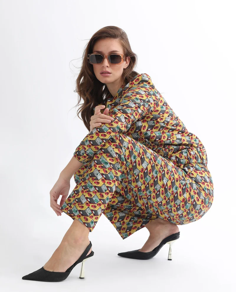 Rareism Women Hertie-B Yellow Cotton Blend Fabric Straight Fit Geometric Print Ankle Length Trousers