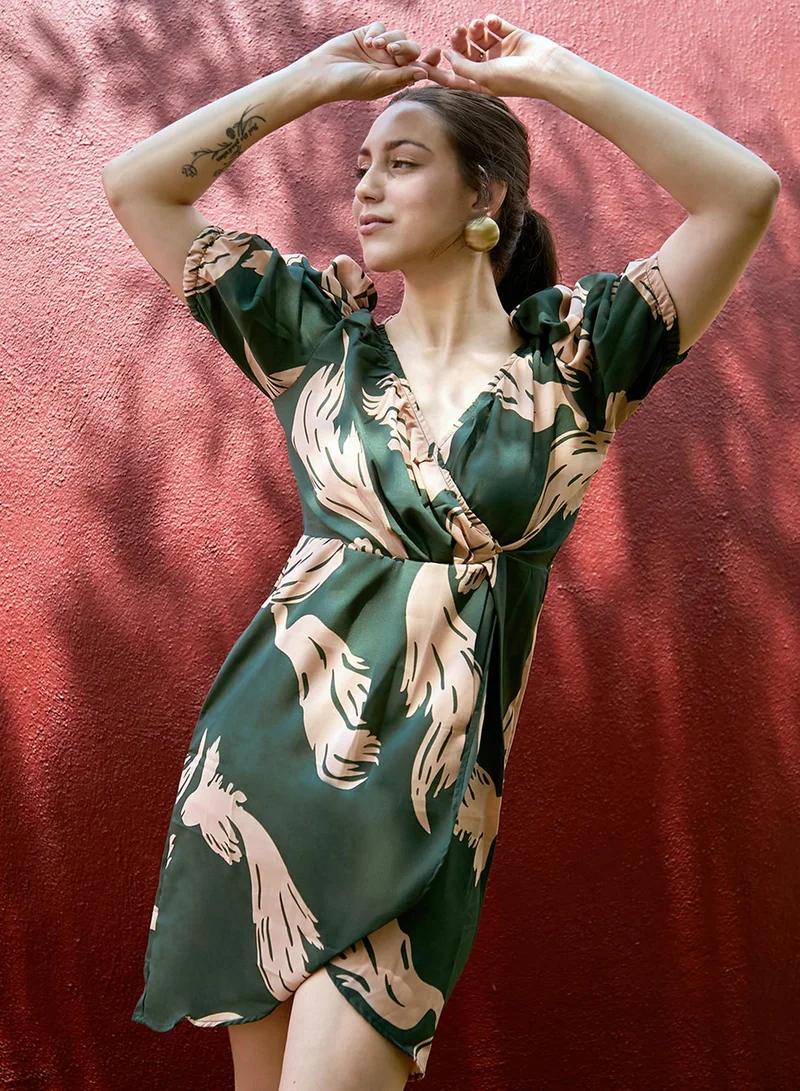 ISHIN Women Printed V Neck Cotton A-Line Midi Dress