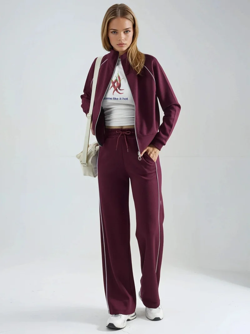 ISTANBUL Contrast Binding Detailed Zippered Sweatshirt & Jogger Two-Piece Set