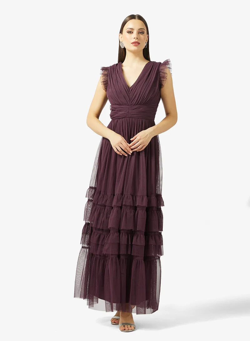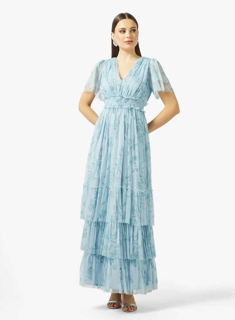 V Neck Shirred Waist Tiered Tulle Maxi Dress