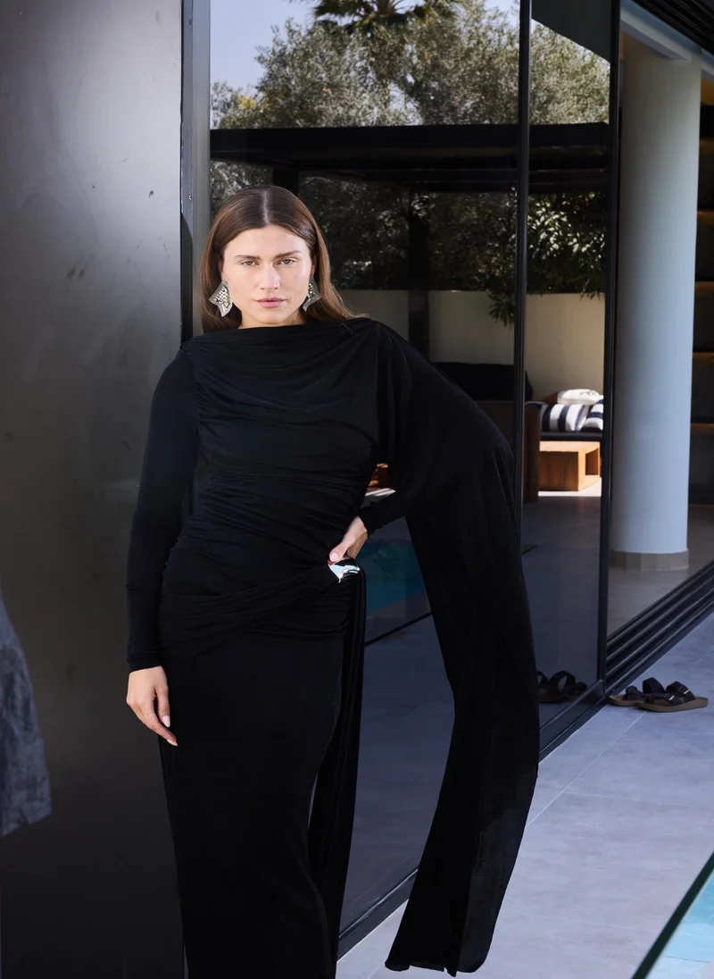 Ruched Mesh Draped Maxi Dress with Brooch Detail