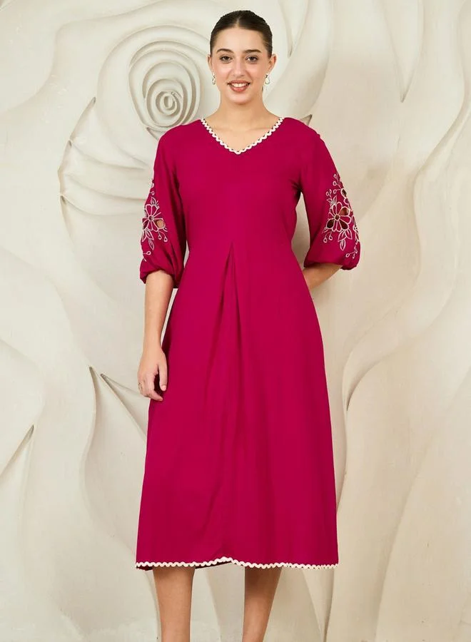 Pink Embroidered Puff Sleeve Cotton Midi Dress