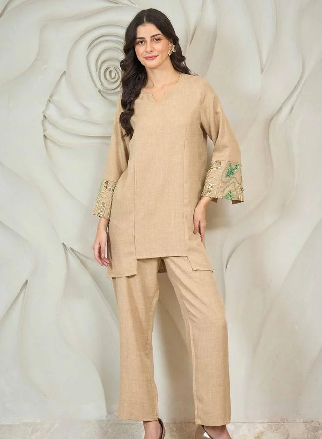 Cream Beaded Detail Wrap Shirt and Pants Co-ords