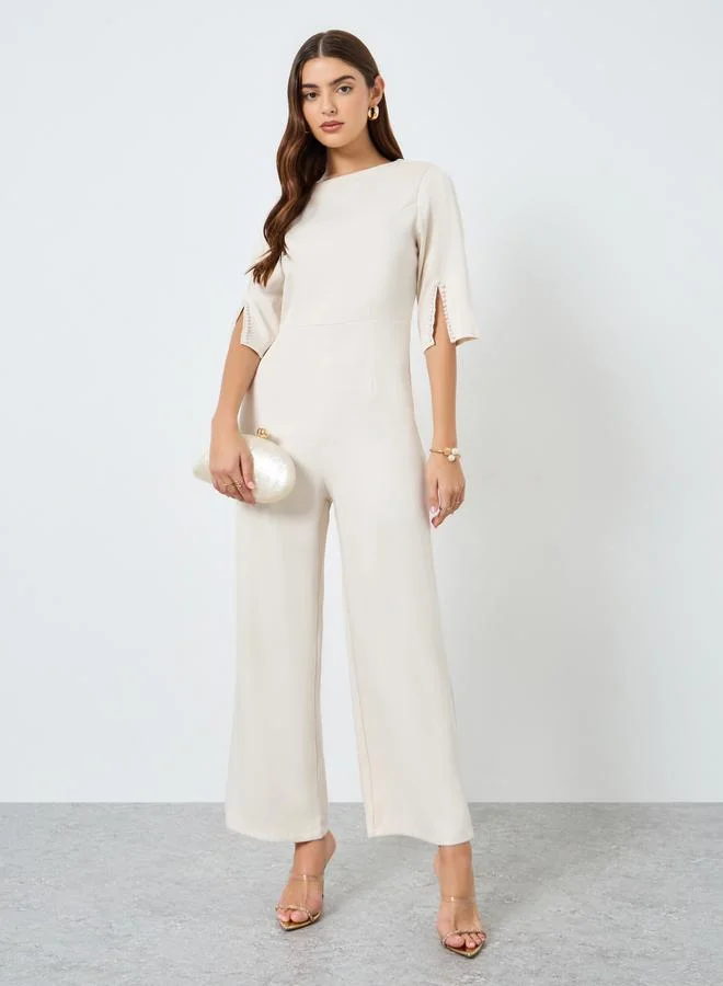 Solid Slit Sleeve Fitted Waist Jumpsuit