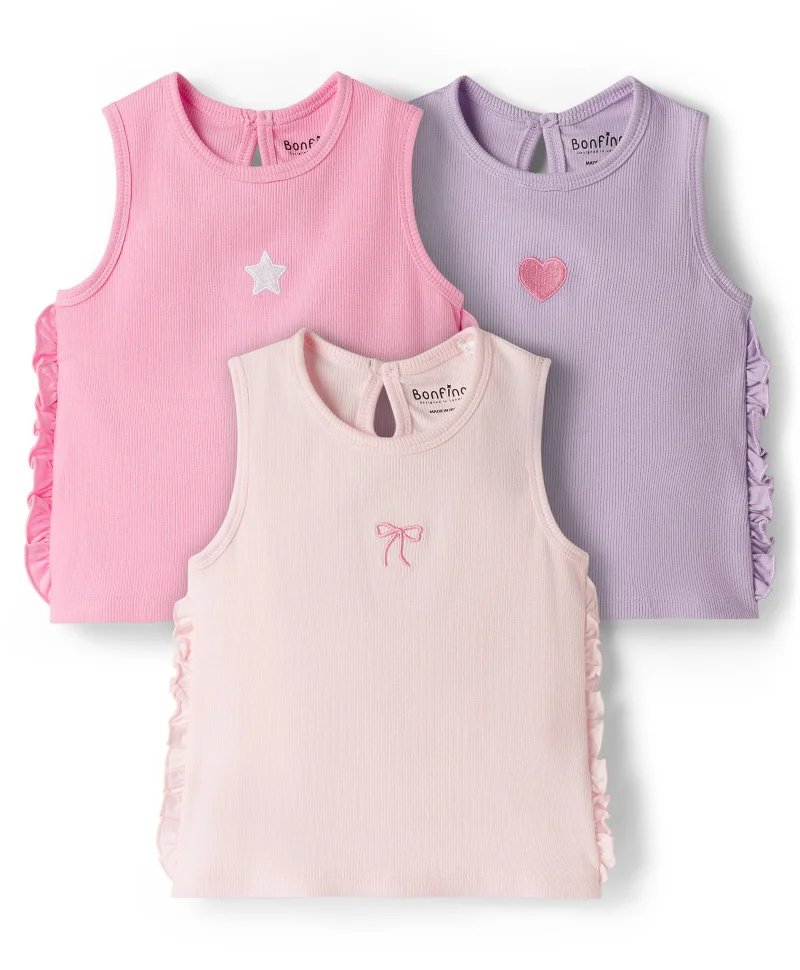 Bonfino 100% Cotton Rib Sleeveless Tops with Embroidery (Pack of 3) - Pink/Purple/Beige