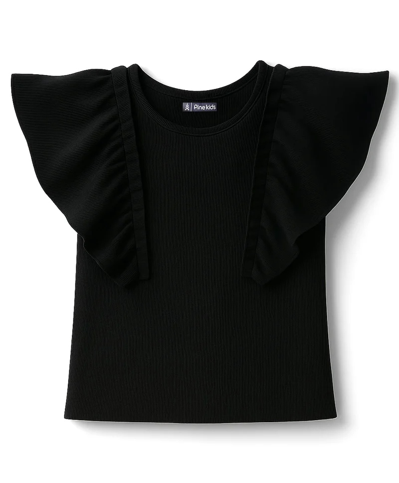 Pine Kids Cotton Knit Half Flutter Sleeves Solid Color Top - Black