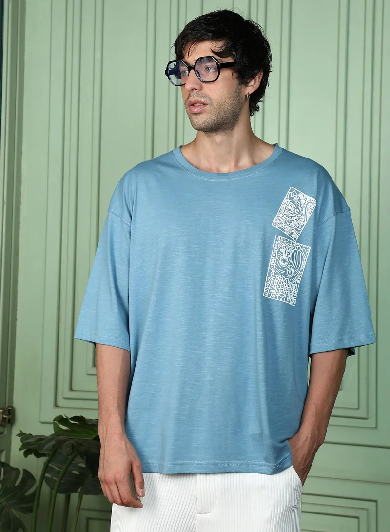 Men Animal-Farm Imprint Oversized T-Shirt | Crew Neck, Short Regular Sleeves | Pull On , Straight Hem | Graphic Print Jersey | Knitted Fabric For Casual & Daily Wear | Sky Blue
