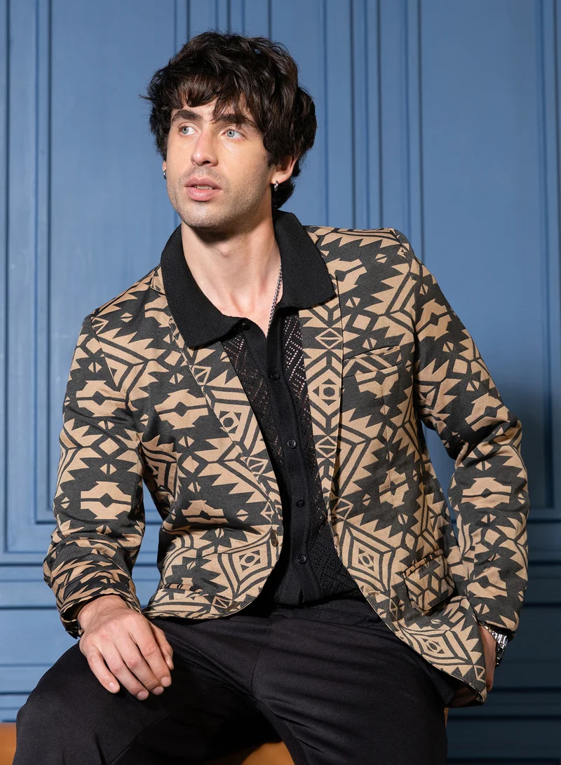 Men Tailored Aztec-Block Jacquard Blazer | Lapel Collar, Long Split-Button Set-In Sleeves | Button , Straight Hem | Jacquard Woven Fabric For Casual & Evening Wear | Multicolour