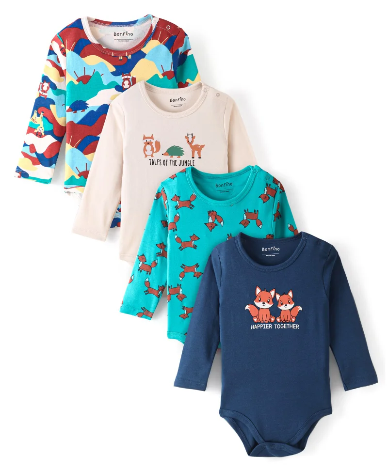 Bonfino 100% Cotton Full Sleeves Onesies Fox Print Pack of 4 - Multicolor