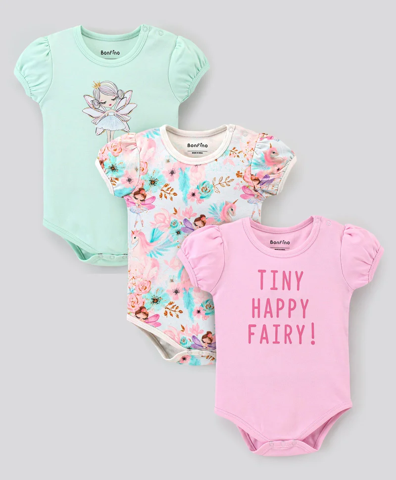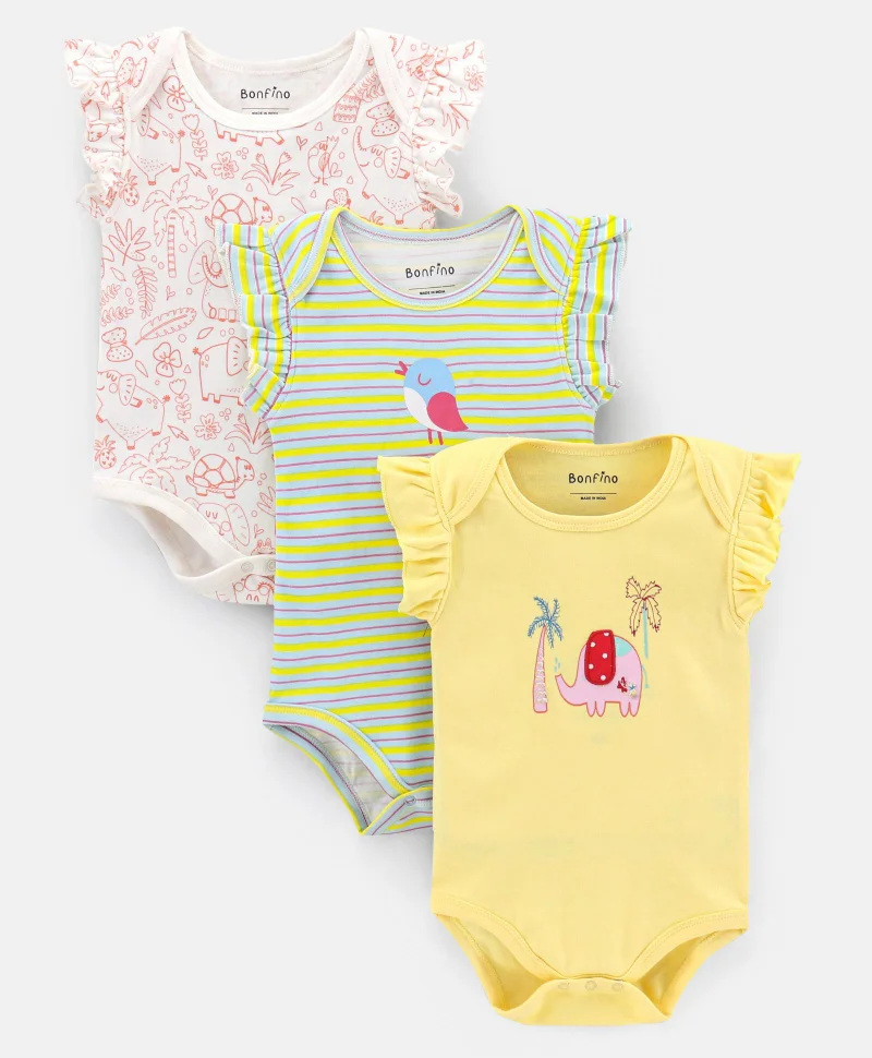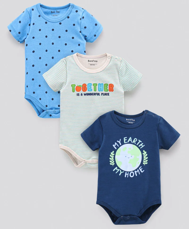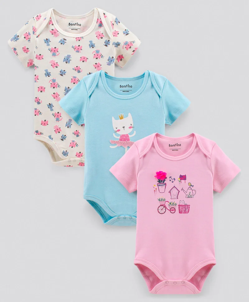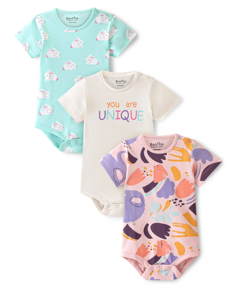 Bonfino Cotton Half Sleeves Onesie Printed Pack of 3- Multicolor
