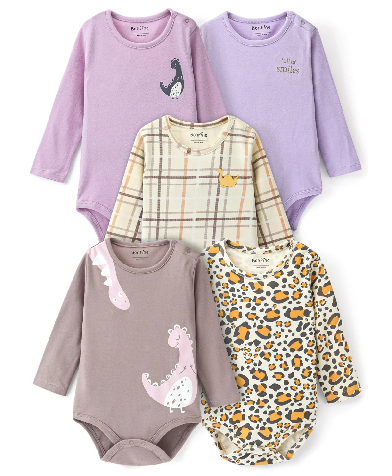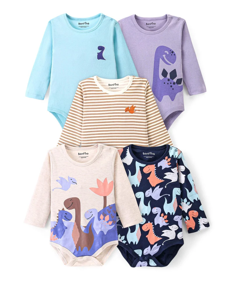 Bonfino Cotton Full Sleeves Onesies With Dino Print Pack Of 5 - Multicolour