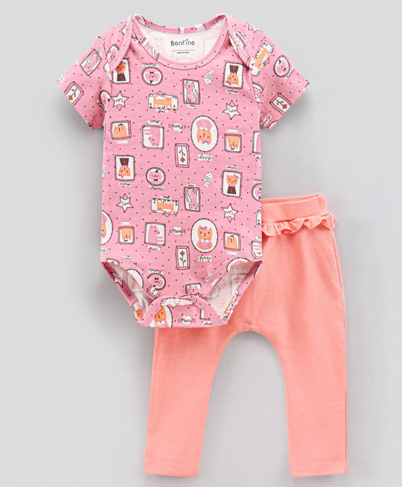 Bonfino Half Sleeves Cotton Onesies With Leggings Kitty Print - Pink