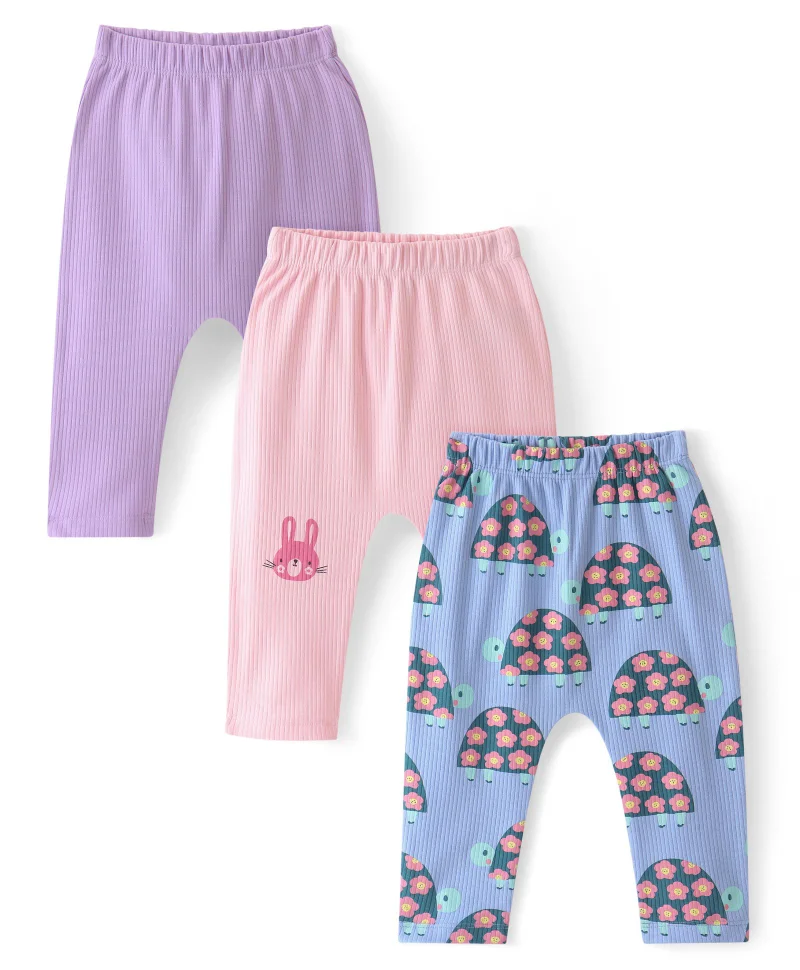 Bonfino 100% Cotton Knit Full Length Diaper Legging Solid Color & Turtle Print Pack Of 3 - Blue Lilac & Light Pink