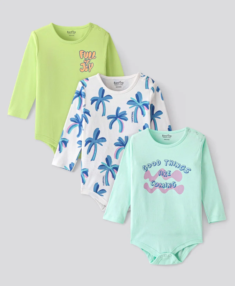 Bonfino - 100% Cotton Full Sleeves Onesies Text & Tropical Print Pack of 3 - Multicolor