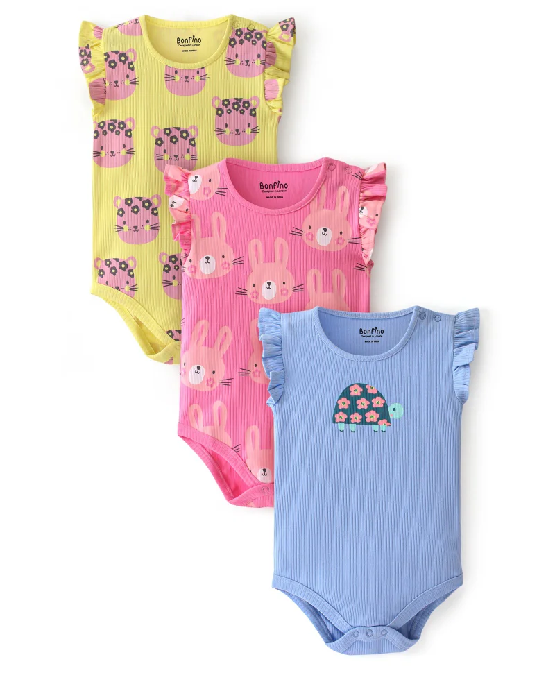 Bonfino 100% Cotton Knit Sleeveless Onesies with Bunny Print Pack of 3 - Pink, Yellow & Blue