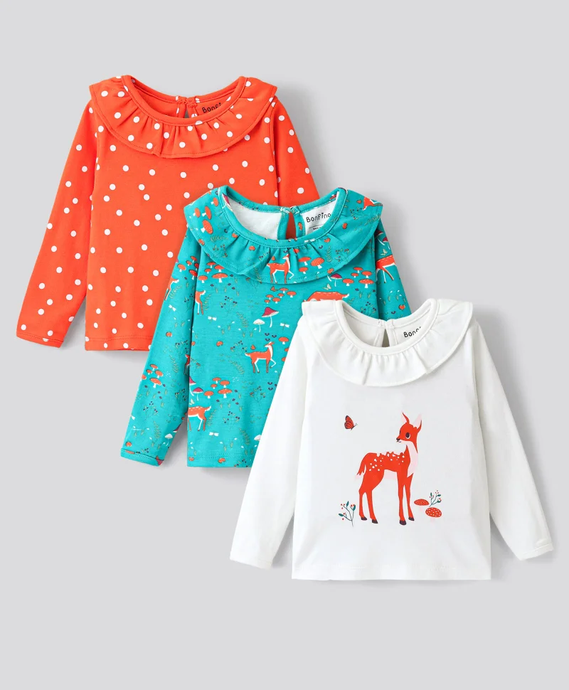 Bonfino Interlock 100% Cotton Knit Top With Dear & Polka Dots Print Pack Of 3 - Orange Green & White