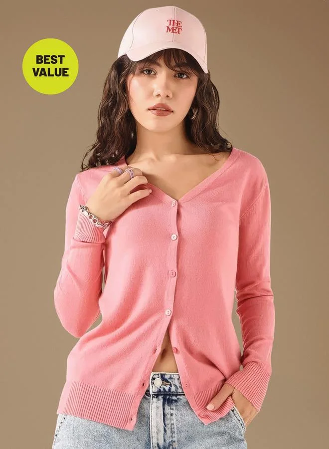 2Xtremz Solid V-Neck Cardigan with Long Sleeves and Button Closure