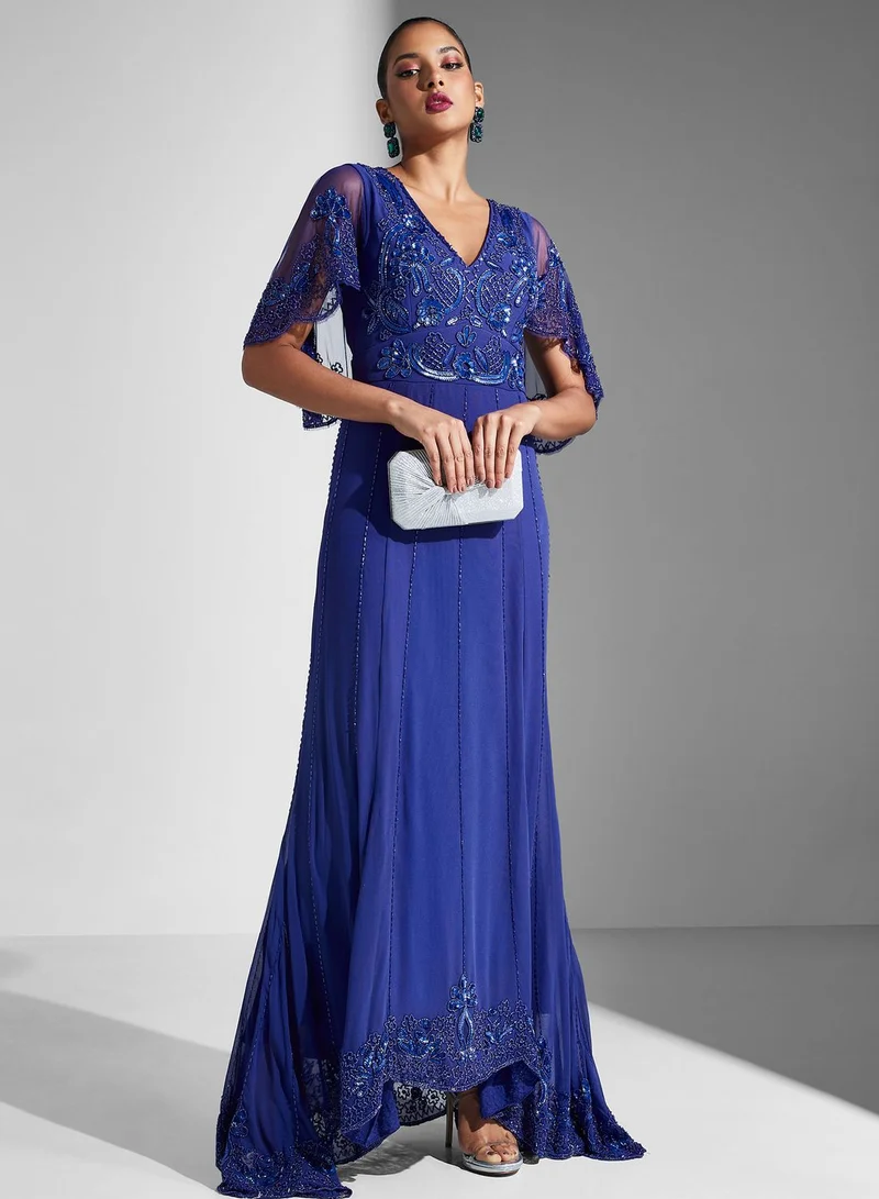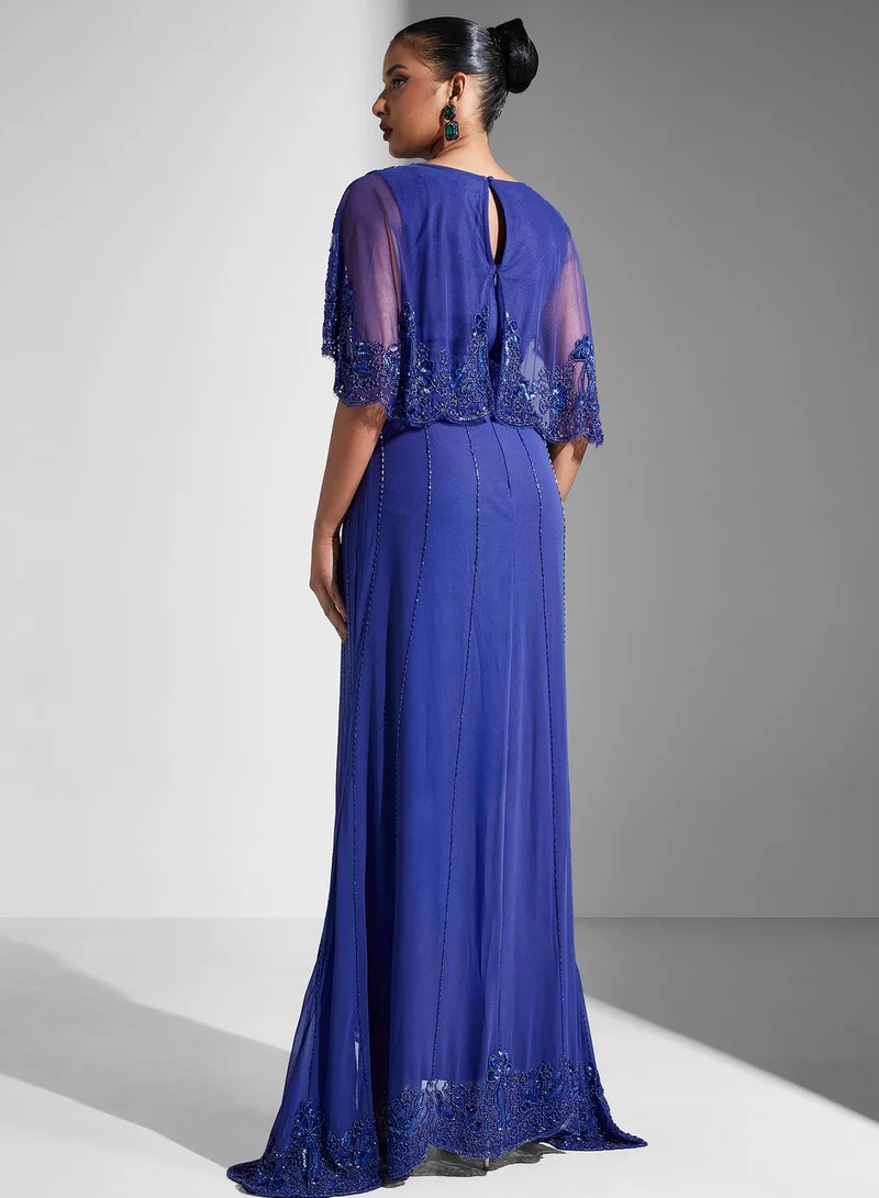 This elegant, long blue dress features delicate embroidery and sheer sleeves, making it the perfect choice for a special occasion. The dress has a flattering V-neckline and a flowing skirt that moves gracefully.