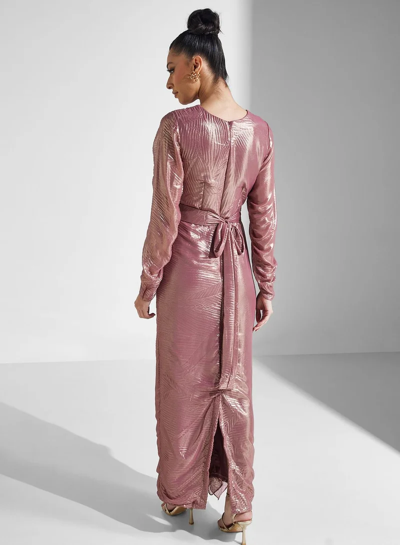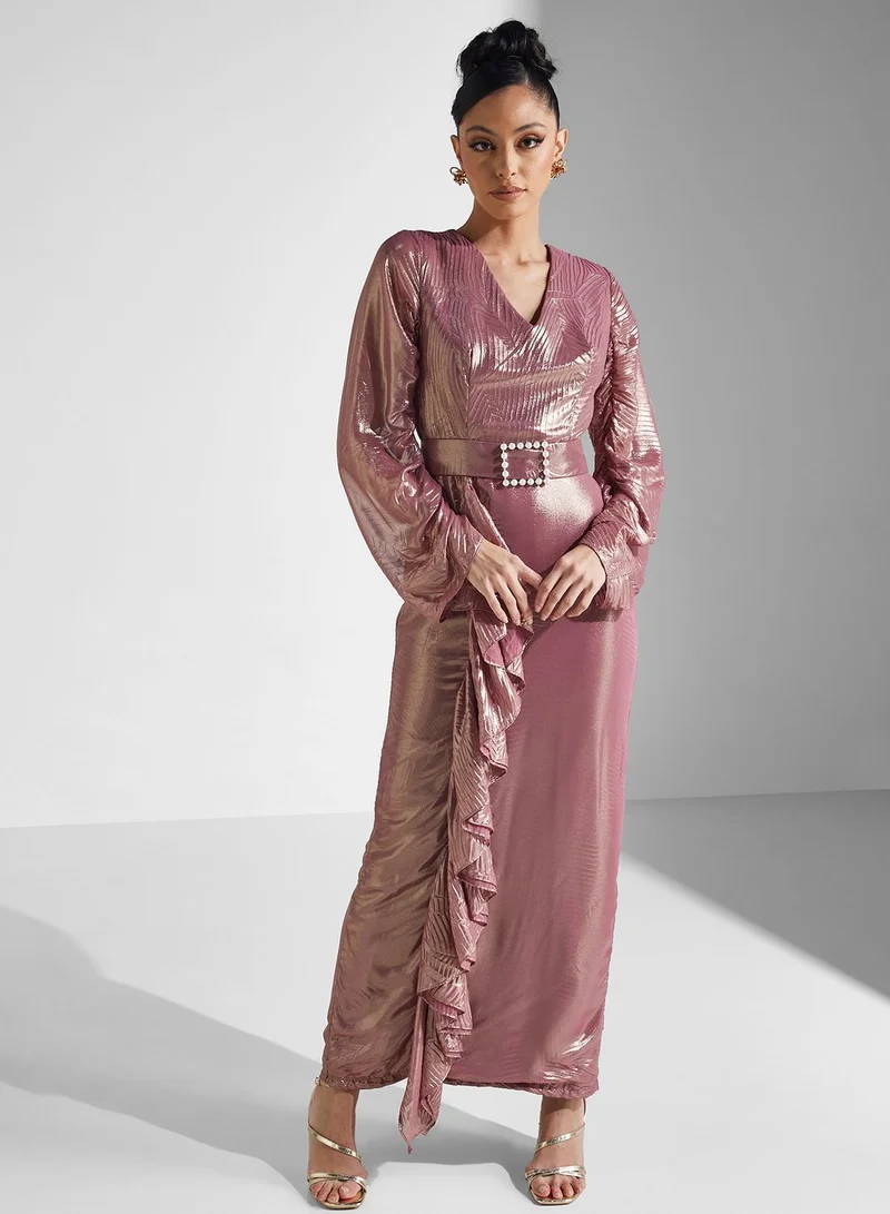 This beautiful metallic maxi dress features long sleeves, a flattering V-neckline, and an eye-catching ruffled accent for added texture. The dress is cinched at the waist with a matching belt and an embellished buckle.