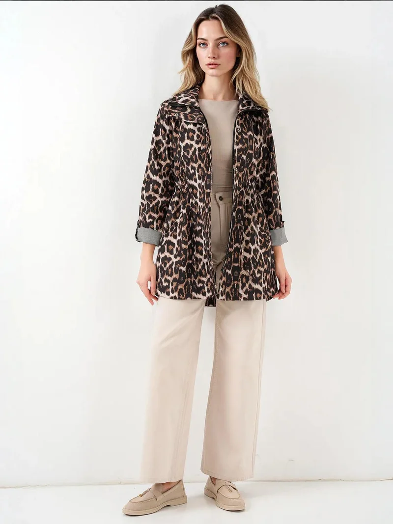 Elevate your outerwear collection with our Leopard Print Trench Coat featuring a stylish drawstring closure. Made from high-quality polyester, this coat combines comfort with trendy design. The relaxed fit and three-quarter sleeves ensure easy wear, while the middle thickness provides the perfect balance for various weather conditions. The jacket collar adds elegance, making this trench coat a versatile addition to your wardrobe. Whether you're dressing up or down, make a bold fashion statement with this eye-catching piece.