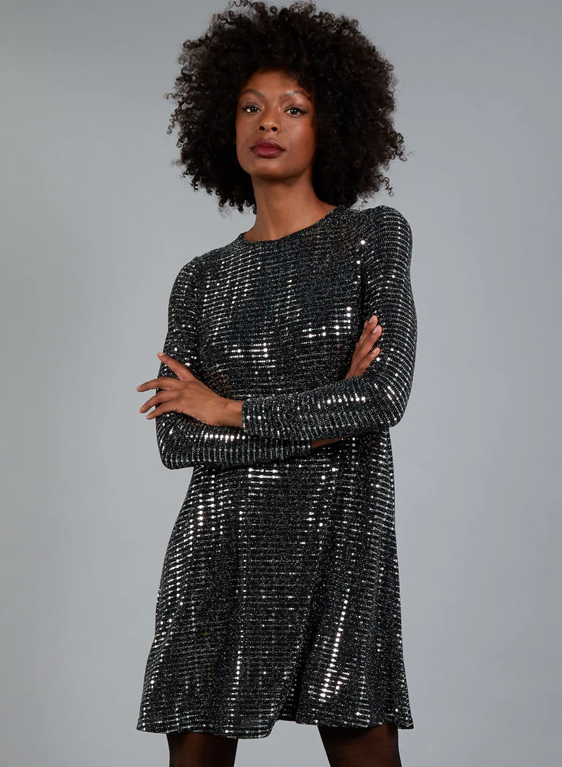 You will look stunning in this fabulous swing dress. Embellished with delicate silver mirrors to catch the light and make you sparkle and shine through the crowd