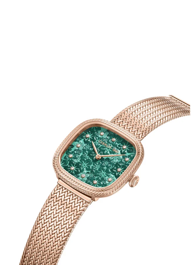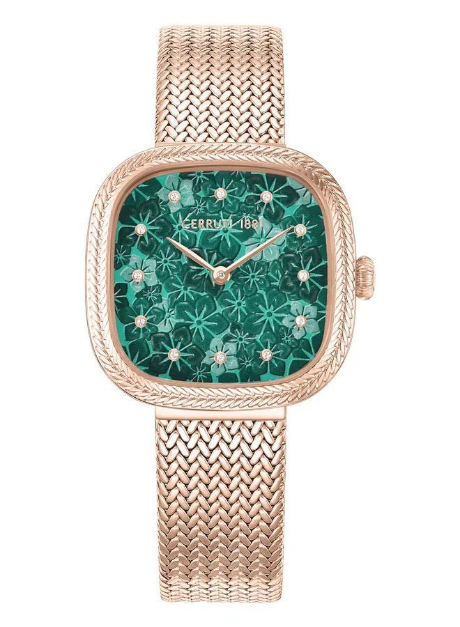 Cerruti 1881 poetically unites feminine aesthetics and floral design in its latest collection - Gresta. Inspired by summer blooms, Cerruti 1881 brings alive the summer beauty on this watch through meticulous details. The floral green dial and the etched bezel, accompanied by a matching mesh bracelet, is guaranteed to bring glamour to every day and every style. The crystal idexes lend a hint of refinement.